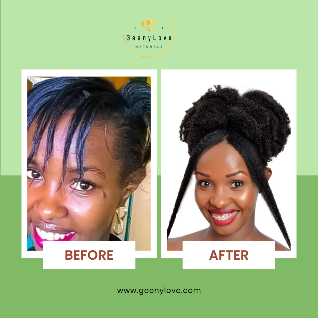 After months of testing and patience, her hairline grew back, her strands strengthened, and her confidence returned. That transformation inspired the creation of Geeny Love, a brand born from real results, natural care, and self-love.