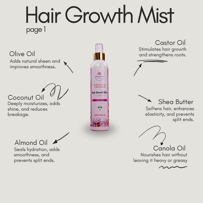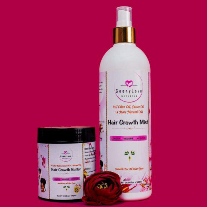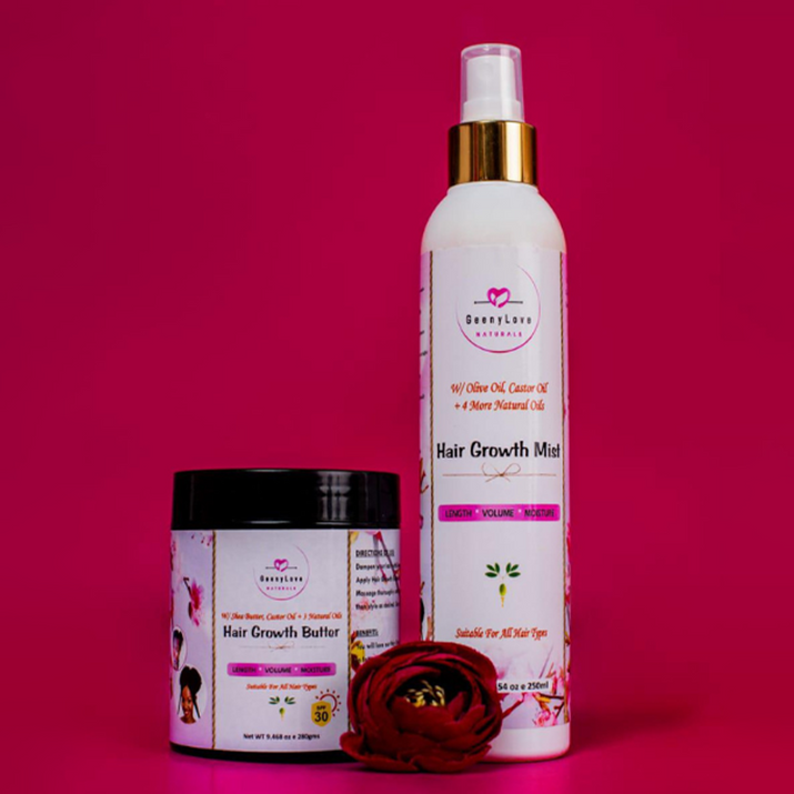 It includes the Hair Growth Mist and Hair Growth Butter, two nutrient-rich essentials formulated with natural oils, vitamins, and fatty acids that keep your hair moisturized, soft, and protected from dryness and breakage.