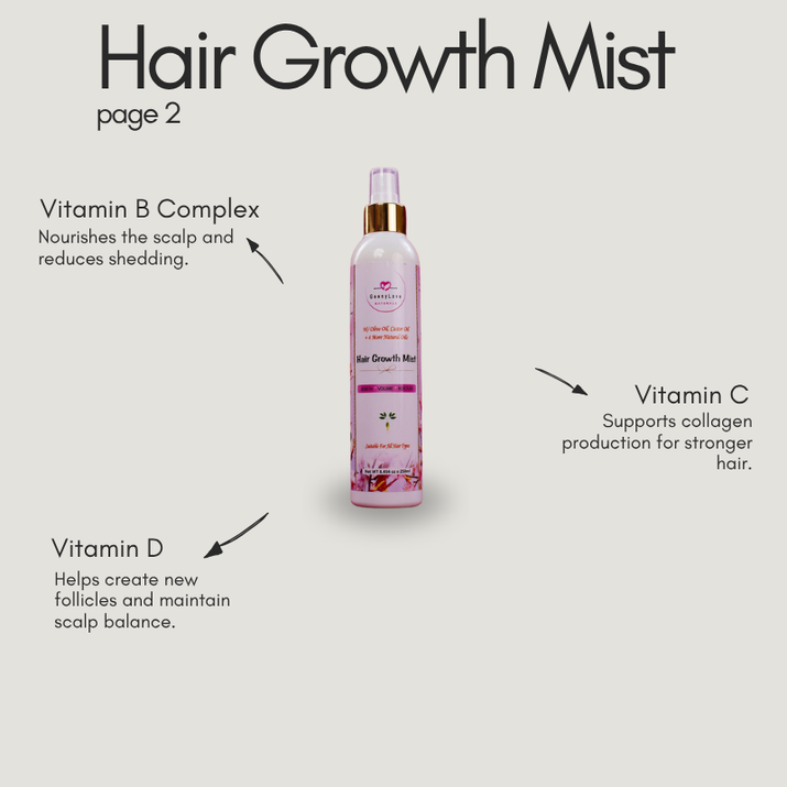 Start by spraying the GeenyLove Hair Growth Mist evenly on your scalp and hair strands to add moisture and activate nutrients.